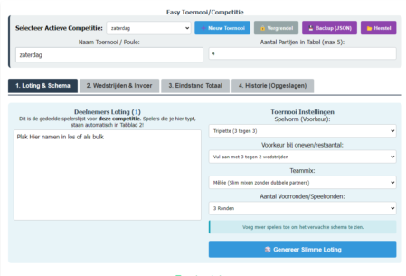 Smart Loting: Onze intelligente computer onthoudt wie met wie speelt. Met één klik creëer je een nieuwe indeling waarbij iedereen steeds met en tegen andere spelers staat. Geen dubbele combinaties meer!Live Klassement: Elke punt telt! Het programma houdt automatisch een ranglijst bij op basis van winstpartijen en doelsaldo. Wie wordt de winnaar van de dag?